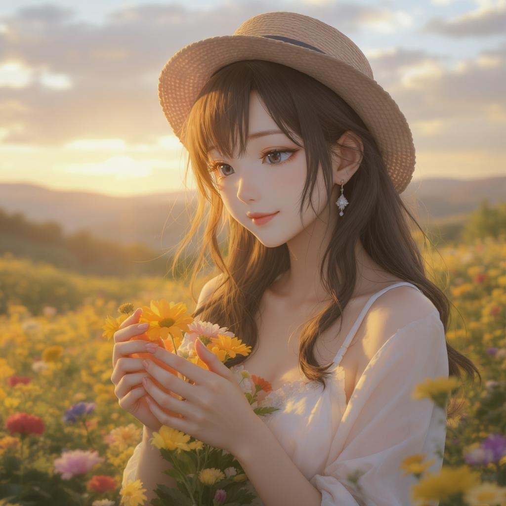 A close-up portrait of a beautiful woman enjoying the warmth of the summer dawn as she gathers colorful flowers in a meadow. Her serene expression and delicate hands are highlighted as the soft morning light bathes her features. The scene captures the essence of a calm and picturesque moment, reminiscent of an anime style. The background is a gentle blur of wildflowers and distant hills, creating a harmonious blend of colors and light that enhances the tranquil atmosphere. Her attire is simple and elegant, complementing the natural setting and emphasizing her connection to the peaceful environment around her.
