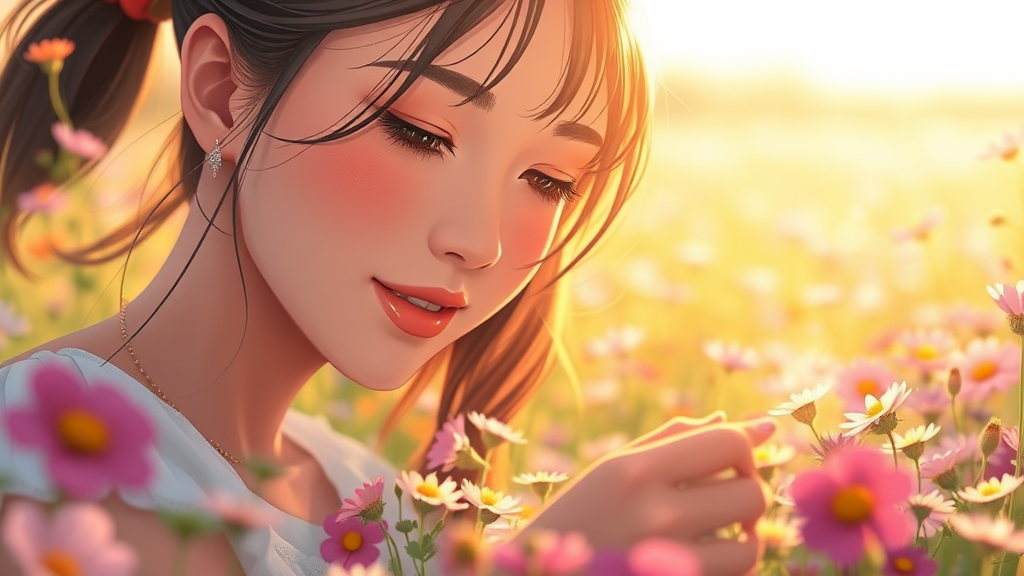 A close up portrait of a beautiful woman gently gathering flowers in a sunlit meadow during a summer dawn, inspired by Ken Sugimori's anime style. She is surrounded by a vibrant array of colorful blooms, capturing the serene beauty of the early morning light. Her expression is peaceful and content as she immerses herself in the moment. The scene is enchanting, with soft pastels and a gentle ambiance that evokes a sense of tranquility and natural beauty. The setting is untouched and pure, emphasizing a connection with nature in an idyllic, dream-like atmosphere.