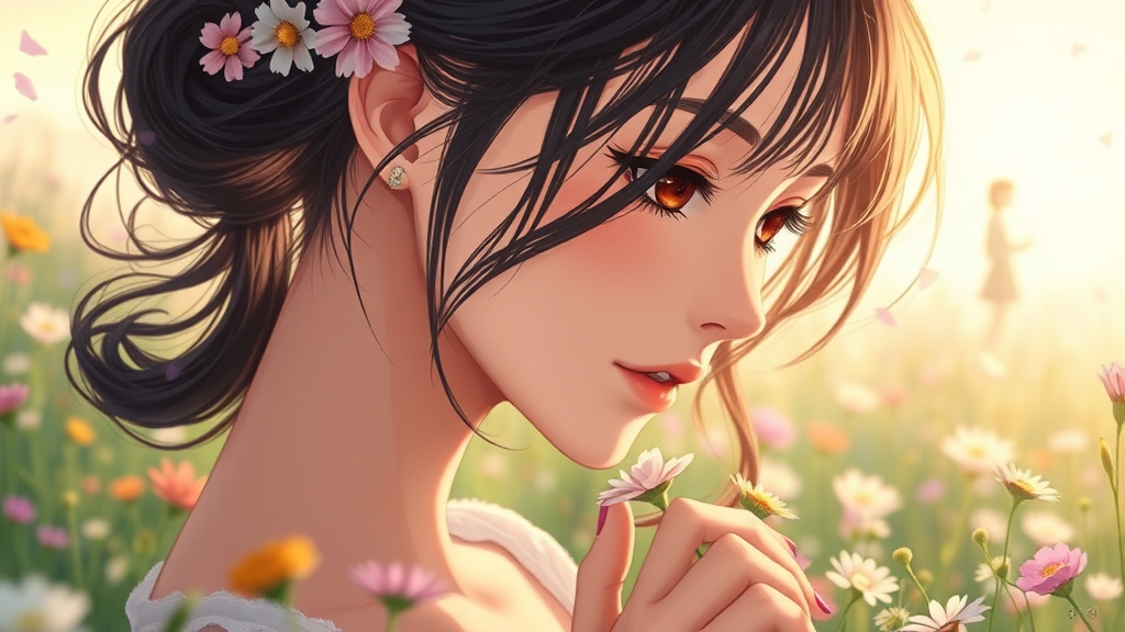 A close-up portrait of a beautiful woman gracefully picking flowers in a serene meadow, capturing the gentle light of a summer dawn. The scene embodies an artistic anime style, inspired by Ken Sugimori, showing a harmonious blend of nature and elegance. The woman's delicate expression is highlighted by the soft morning light, with her hair gently flowing in the breeze. She is surrounded by a vibrant array of flowers, their colors complementing the serene backdrop of the meadow. Her pose and attire are simple yet enchanting, emphasizing the tranquil and idyllic mood of the setting without any distracting elements.