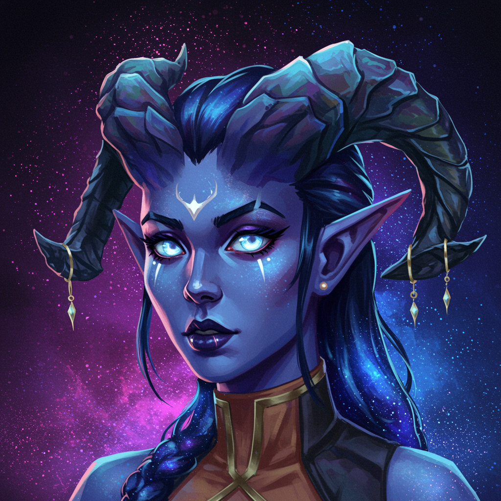 A close-up portrait of a blue-skinned female tiefling with intricately curved horns, featuring a blend of demonic and cosmic elements. Her expression exudes a captivating mix of mystery and strength, with luminous eyes that seem to hold the secrets of the universe. The horns are lush and beautifully detailed, complementing her striking anime-inspired features. Her skin has an ethereal glow, adorned with celestial patterns reminiscent of a night sky. Her attire is a blend of elegant fantasy and modern style, reflecting a sense of otherworldly allure. The overall artwork is painted in a vibrant, dynamic style that combines elements of both traditional and digital art, reminiscent of the Arcane series’ distinct aesthetic.