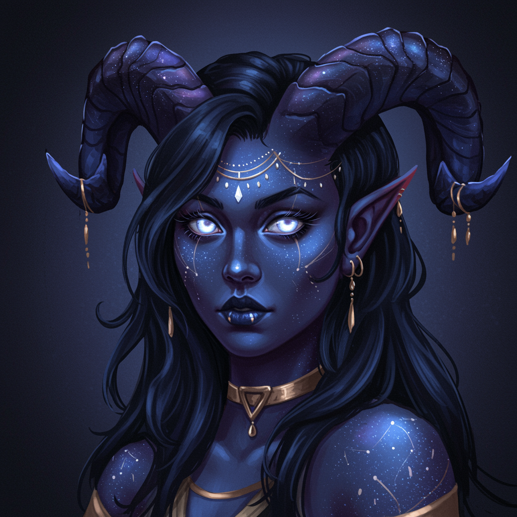 A close-up portrait of a female tiefling with lush, curled horns and a striking demon visage, her skin a cosmic shade of blue adorned with subtle celestial patterns. Her piercing eyes glow with an ethereal light, reminiscent of mystical anime characters, while her expression exudes both strength and allure. Her hair cascades in dark, flowing waves, complementing her otherworldly appearance. She wears intricate jewelry that glistens like stardust, adding elegance to her demonic charm. Painted in a style inspired by Arcane, capturing the depth and intensity of her enigmatic presence, this tiefling embodies both mystique and power.