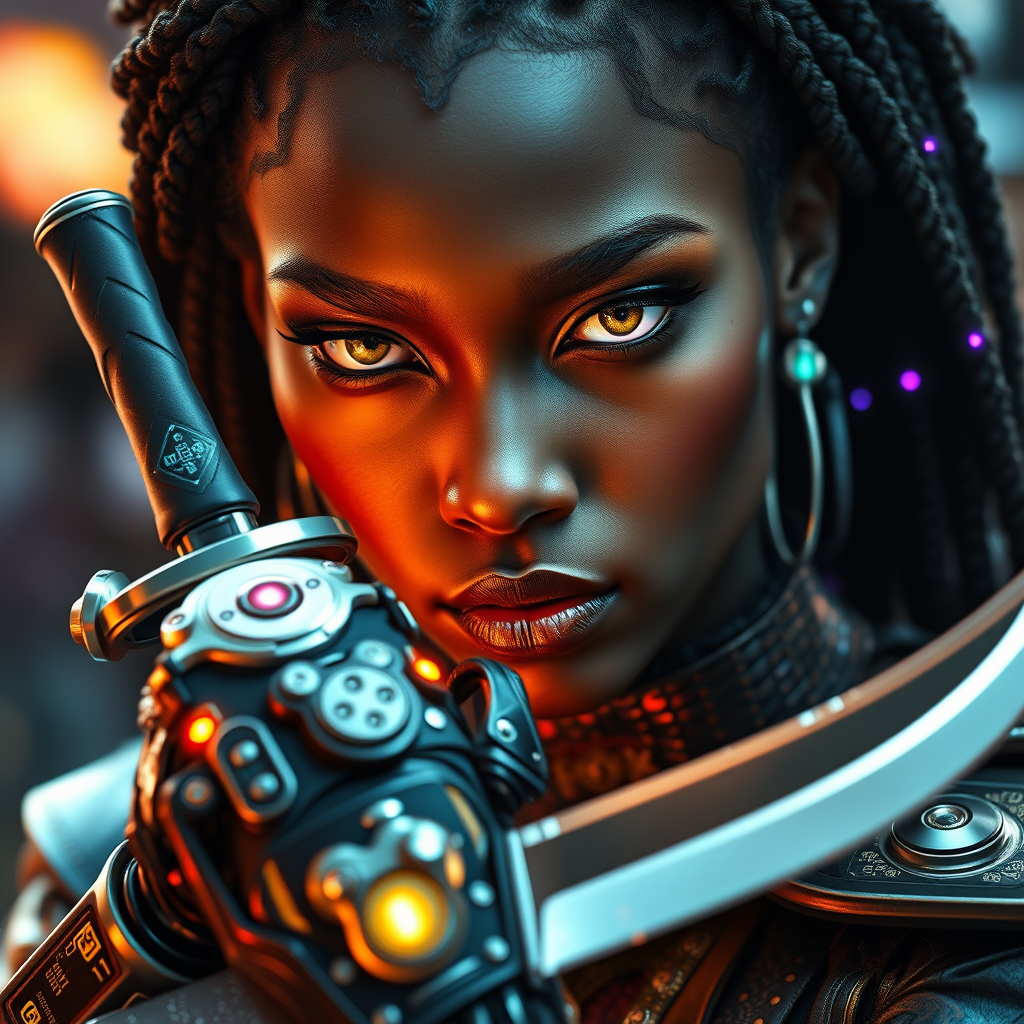 A close-up portrait of a fierce African cyberpunk wizard woman, her eyes glowing with luminescent energy, intricately adorned in sleek, futuristic attire that blends vibrant Afrofuturism aesthetics with cybernetic enhancements. Her hand, clad in a stylish, high-tech glove, brandishes a gleaming knife with a handle embedded with digital circuitry. Her attire merges steampunk and cyberpunk elements, featuring intricate metallic patterns and holographic textures. Her mechanoid arm, elegant yet imposing, incorporates advanced technology with traditional African motifs. Her expression is determined and mysterious, reminiscent of a shadowy merchant in the bustling alleys of a futuristic city. Her presence evokes the regal aura of Ororo Munroe and the confident strength of Loba Andrade. Her braided hair is intertwined with LED fibers that pulse with a rhythmic light. As a teenage black cyborg, she embodies the spirit of a cybernetic alchemist, seamlessly bridging the worlds of the ancient and the avant-garde in a visually stunning display of Afro-cybernetic fusion.