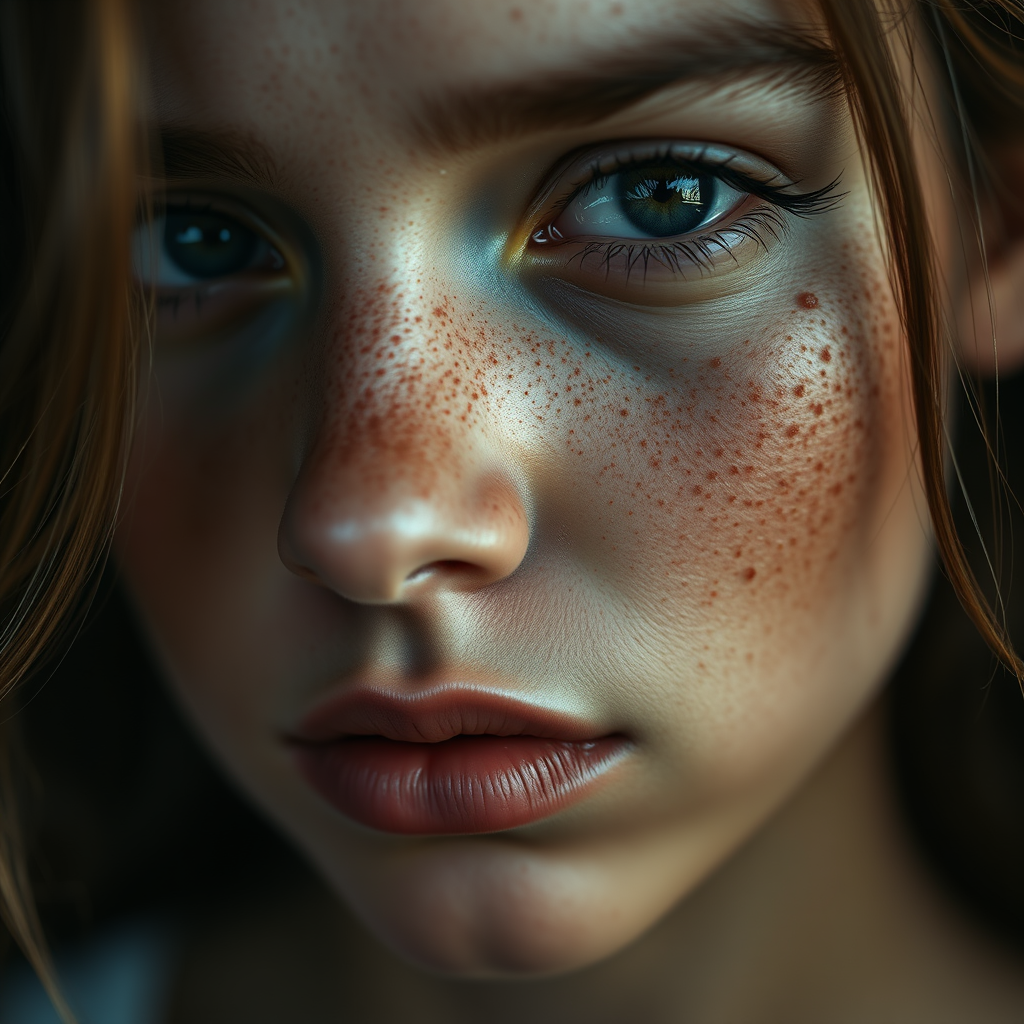 A close-up portrait of a freckled young woman with rich brown skin reminiscent of fertile earth, captured in hyperrealistic detail. Styled akin to the works of Albert Watson, her expression is a delicate balance of timidity and vulnerability, evoking a sense of youthful introspection. The image carries the artistic essence of Antoni Pitxot and the evocative style of Graham Humphreys, combined to suggest an epic music album cover. Her features are smooth and elegantly shaded, emphasizing her natural beauty. The composition has an aspect ratio of 3:4, lending an intimate framing to the image.