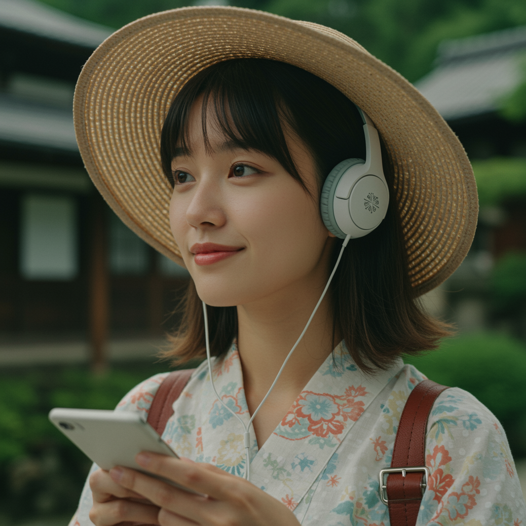A close-up portrait of a girl enjoying music as she strolls through a picturesque Japanese summer landscape. The scene captures her centered, showcasing her breathtaking beauty with an exquisite level of detail. The cinematic feel enhances the serene atmosphere, influenced by the artistic style akin to Lois van Baarle. The moment is vibrant and peaceful, set against a backdrop of lush greenery and traditional architecture. The girl's expression is one of contentment and immersion in the music, embodying the tranquility and beauty of a summer day in Japan.