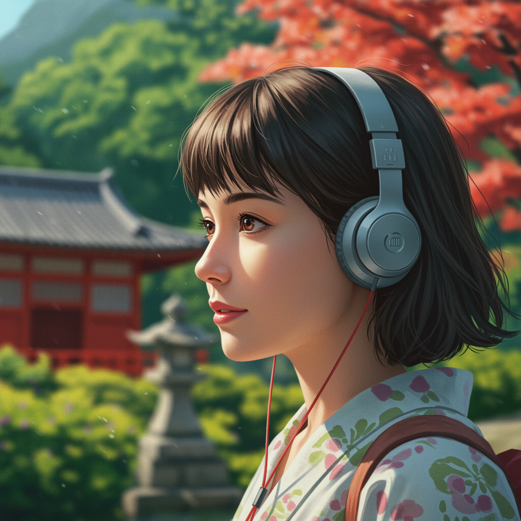 A close-up portrait of a girl enjoying music through headphones as she strolls through a vibrant Japanese landscape during the summer. The scene captures her serene expression and the lush surroundings. The setting is meticulously detailed, exhibiting breathtaking beauty with a cinematic quality similar to the style of Lois van Baarle. The focus is on the harmonious blend of natural beauty and tranquility, evoking a sense of peaceful escape without any distortions or imperfections.