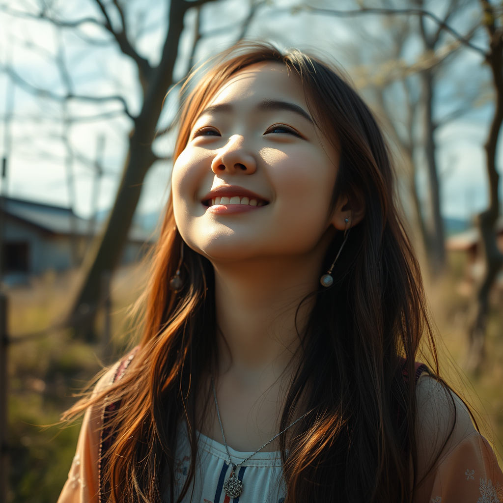 A close-up portrait of a girl experiencing the joy of music as she walks through a serene Japanese landscape in the summer. The scene captures her breathtaking beauty with a focus on rich detail and cinematic quality, inspired by the works of Lois van Baarle. The composition is centered, emphasizing the tranquility and harmony of the natural setting around her. Her expression reflects contentment and immersion in the music, enhancing the visual narrative of the moment.