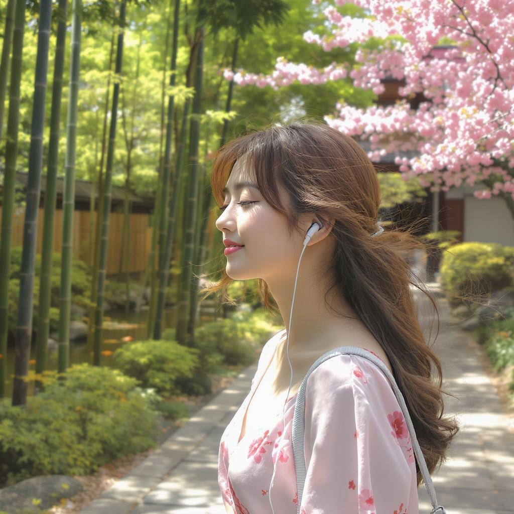 A close-up portrait of a girl immersed in listening to music as she strolls through a picturesque Japanese landscape during a vibrant summer. The scene captures her in exquisite detail, showcasing her breathtaking beauty and cinematic presence. The focus remains on her serene expression, surrounded by the lush and tranquil environment, accentuated by the soothing soundscape. The image is free from any distortions or distractions, ensuring an unobstructed view of the harmonious blend of nature and personal tranquility.