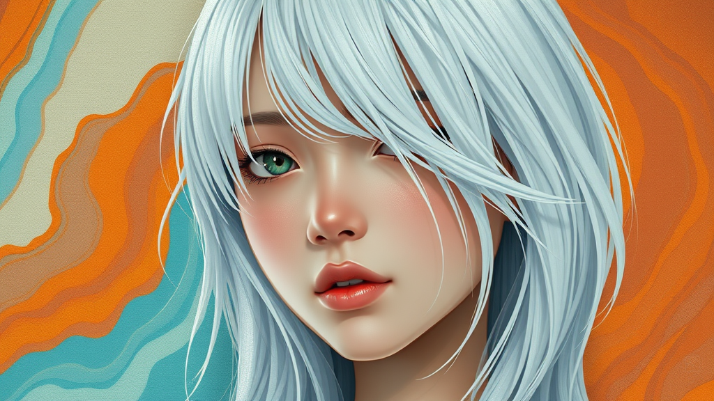 A close-up portrait of a girl with striking white hair, depicted in a style blending Ross Tran's vivid comic art influence with the realistic textures reminiscent of Guido van Helten's murals. Her serene expression contrasts against a dynamic background of undulating shades of light teal and deep orange, evoking the fluidity of marine paintings. The scene incorporates a subtle animated element, like the gentle ripple of water or a flickering light, enhancing the ethereal quality. The combination of these artistic styles and colors creates a striking, stylized piece with a harmonious yet vibrant atmosphere.