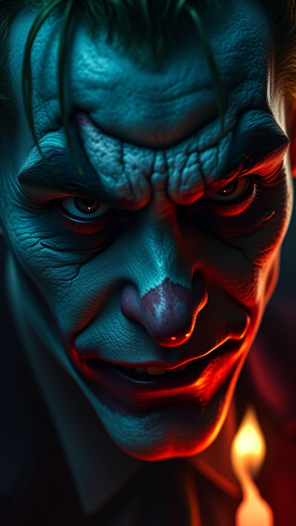 A close-up portrait of a joker in the style of Christopher Nolan, capturing an intelligent, serious demeanor with a calm yet unsettling atmosphere. The scene is lit dramatically to reveal emotional depth, with hyper-realistic digital painting techniques. The image is filled with intricate details reminiscent of Milo Manara and Russ Mills, designed to be unforgettable in its 8K clarity. The joker's expression is unnervingly composed, surrounded by an aura of mystery. Despite the focus on detail and realism, there is a surreal aspect with subtle imperfections and distortions, hinting at mutation or deformation. The anatomy is intriguingly flawed with hints of extra limbs and altered proportions. The setting carries an eerie yet fascinating air, drawing the viewer into a world that is both mesmerizing and disconcerting.