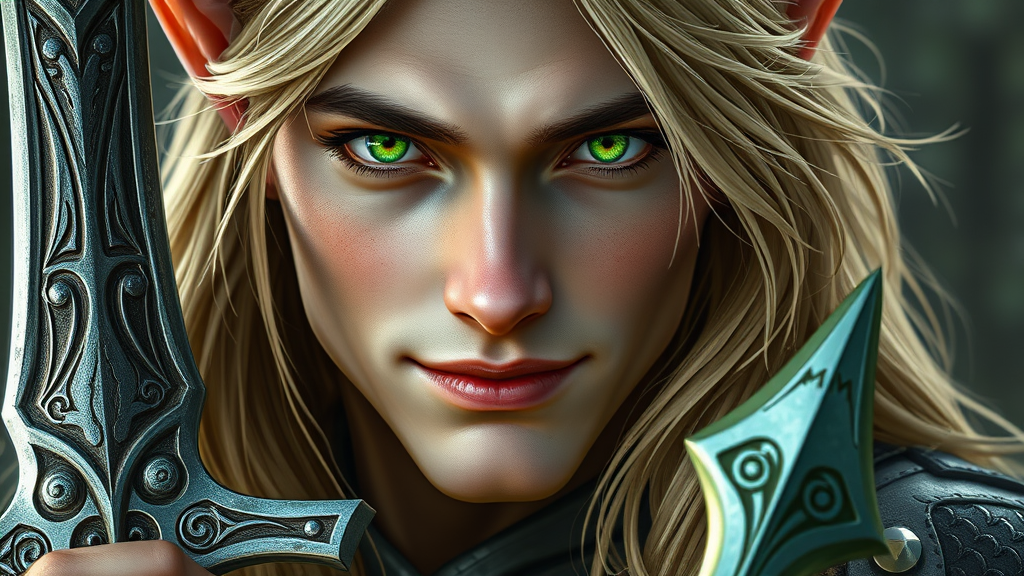 A close-up portrait of a male elf with striking emerald green eyes, his expression a confident smirk. His long, flowing blonde hair cascades over his shoulders, highlighting his angular, ethereal features. He holds a gleaming sword with intricate engravings, symbolizing his status as a skilled and honorable ranger. Adorned in elegant, forest-inspired armor, the elf's presence is both commanding and alluring, embodying the mystical grace of his elven lineage. With a subtle nod to his warlock counterparts, a faint aura of magic shimmers around him, hinting at untapped power and ancient knowledge. His gaze is both piercing and contemplative, capturing the timeless beauty and strength of the legendary elven warriors.