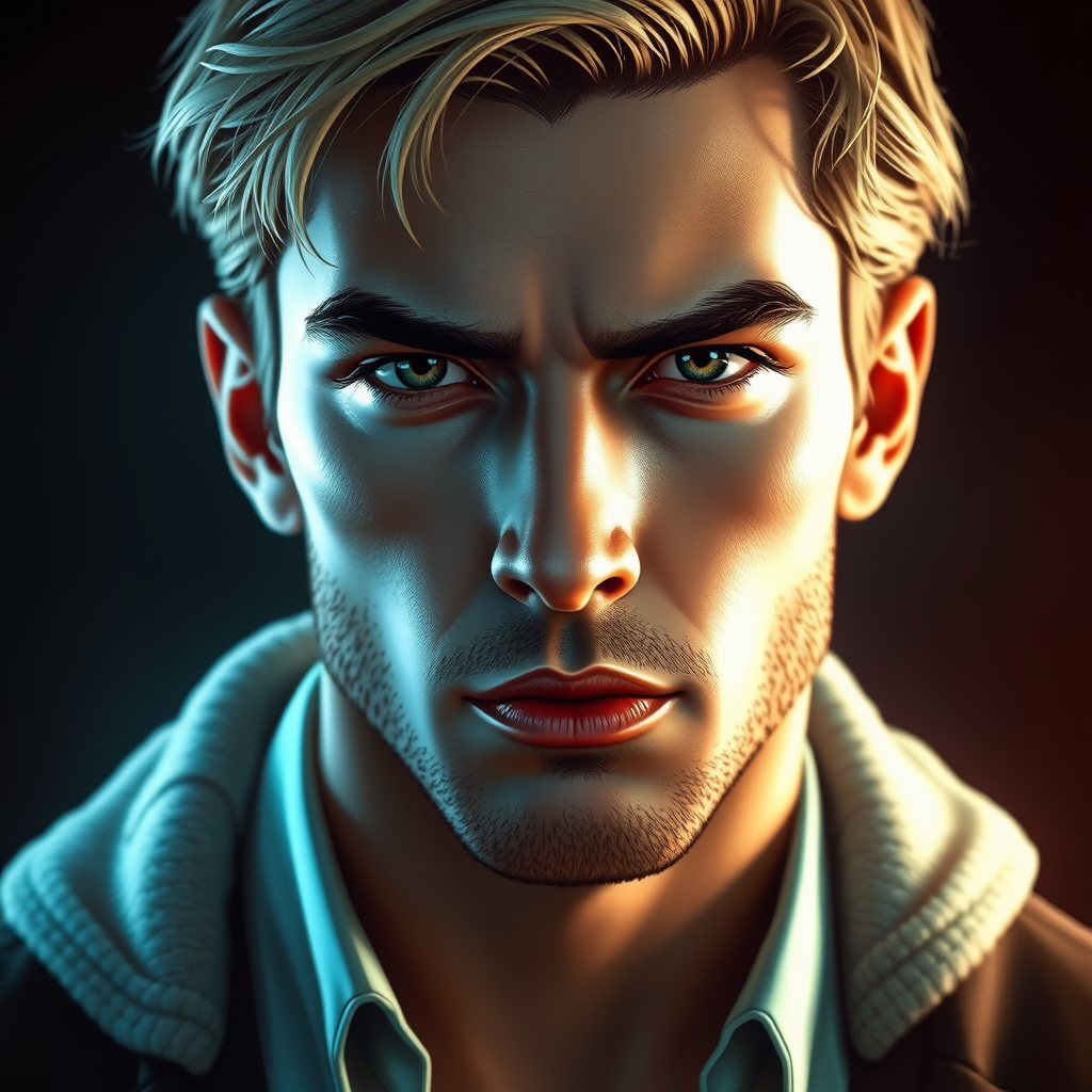 A close-up portrait of a man with dark blond hair, a prominent nose, and clean-shaven face, displaying a serious expression. The image captures his upper body, focusing on head and shoulders, dressed in stylish clothes. The artwork boasts 8k resolution, with concept art influences from dmc_kay and WLOP. It features dynamic lighting and hyperdetailed intricacies with a touch of unique flair. Splash art style is prominent, utilizing a triadic color scheme and enriched with volumetric lighting, staying true to a trending art form.