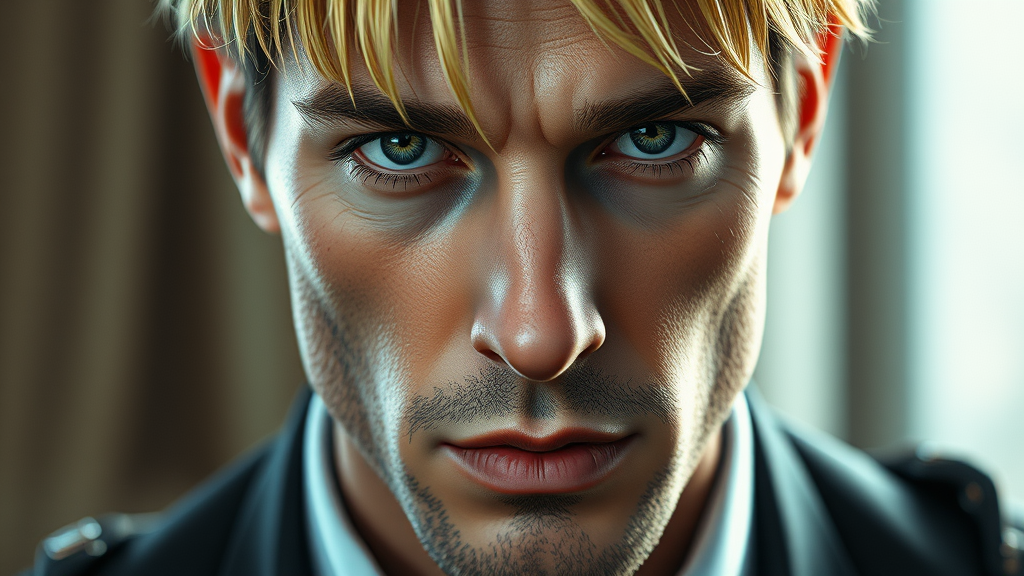 A close-up portrait of a man with dark blond hair and a prominent nose, clean-shaven face exhibiting intricate details and a serious expression. He's dressed in a classic attire, the composition focusing on his upper body, highlighting head and shoulders in an 8k resolution concept art. The portrait, created in the style of DMC_Kay and WLOP, uses dynamic and volumetric lighting with hyper-detailed elements, incorporating a sense of splash and trending art features. The artwork is infused with a triadic color scheme, adding depth and vibrancy to the character's portrayal.