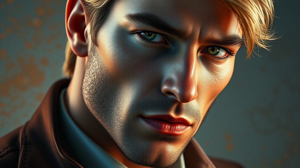 A close-up portrait of a man with dark blond hair, a prominent nose, and clean-shaven features, showcasing intricate face details and a serious expression. He is dressed elegantly in upper body attire, captured from head to shoulders. The image is a concept art piece with dynamic lighting, showcasing hyperdetailed and intricately crafted elements. It utilizes a vibrant splash of triadic colors and employs volumetric lighting to enhance depth and dimension. The artwork draws inspiration from the styles of dmc_kay and WLOP, creating a captivating composition that’s trending in the art scene.