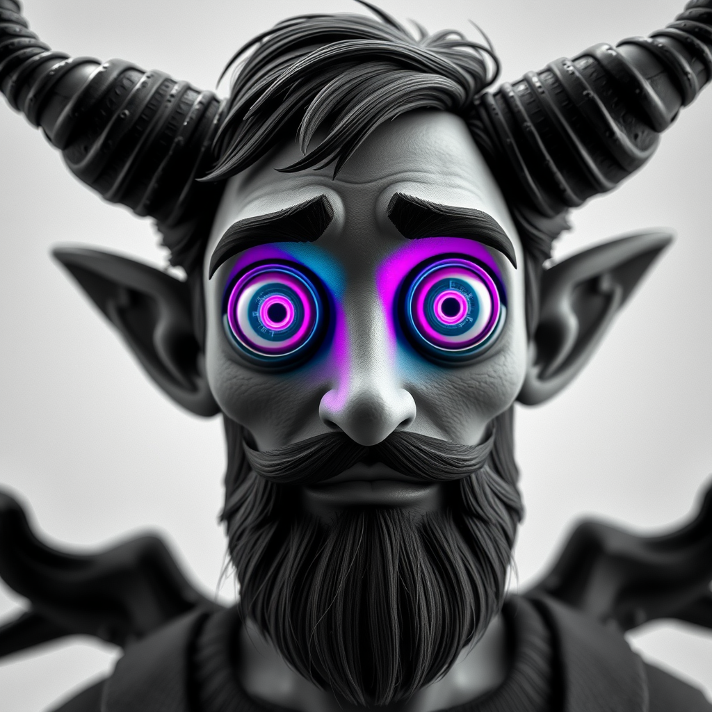 A close-up portrait of a man with horns and a beard, designed by a senior character artist, showcasing a winning style from a computer art contest. Rendered in Unreal Engine 5, the character displays Pixar-like neon eyes, exuding a playful yet eerie aura. The design incorporates features typical of a Pixar render, complete with large, circular reflective eyes. The portrayal is executed with cinematic smoothness and intricate detail, featuring abstract, cartoon-like qualities reminiscent of animated figures. The character has a toy-like appearance and is framed in a 3D setup, with playful disfigurements like extra limbs and an intentionally flawed anatomy. The image is in black and white with splashes of surreal colors, and presents a mix of clarity and blurriness, with elements like textures, text, or watermarks subtly embedded, enhancing the concept’s abstract and oddly whimsical vibe.
