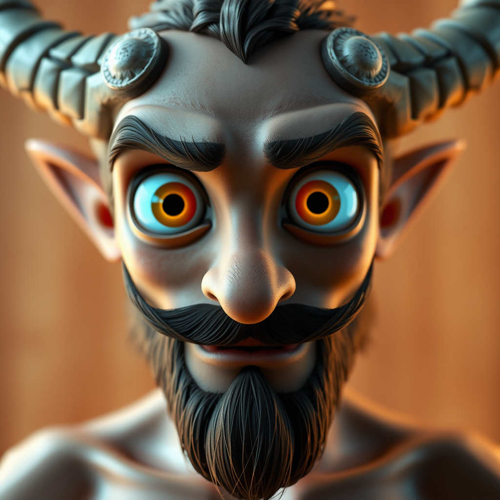 A close-up portrait of a man with horns and a beard, crafted by a senior character artist, winner of a computer art contest, rendered in Unreal Engine 5. The character features bright, clear, neon eyes reminiscent of Pixar's style, evoking a sense of playful animation. The man has cute, big, circular reflective eyes, contributing to the overall cartoonish feel. The render is smooth and cinematic, maintaining intricate details while incorporating an abstract, deformed aesthetic. The figure is animated and toy-like, with some exaggerated and disfigured features, embracing an otherworldly charm. The image includes 3D elements such as hands, and the character is portrayed nude, enhancing its animated and digital nature. This imaginative depiction plays with unconventional anatomy, resulting in an offbeat, blurry effect with vibrant colors.