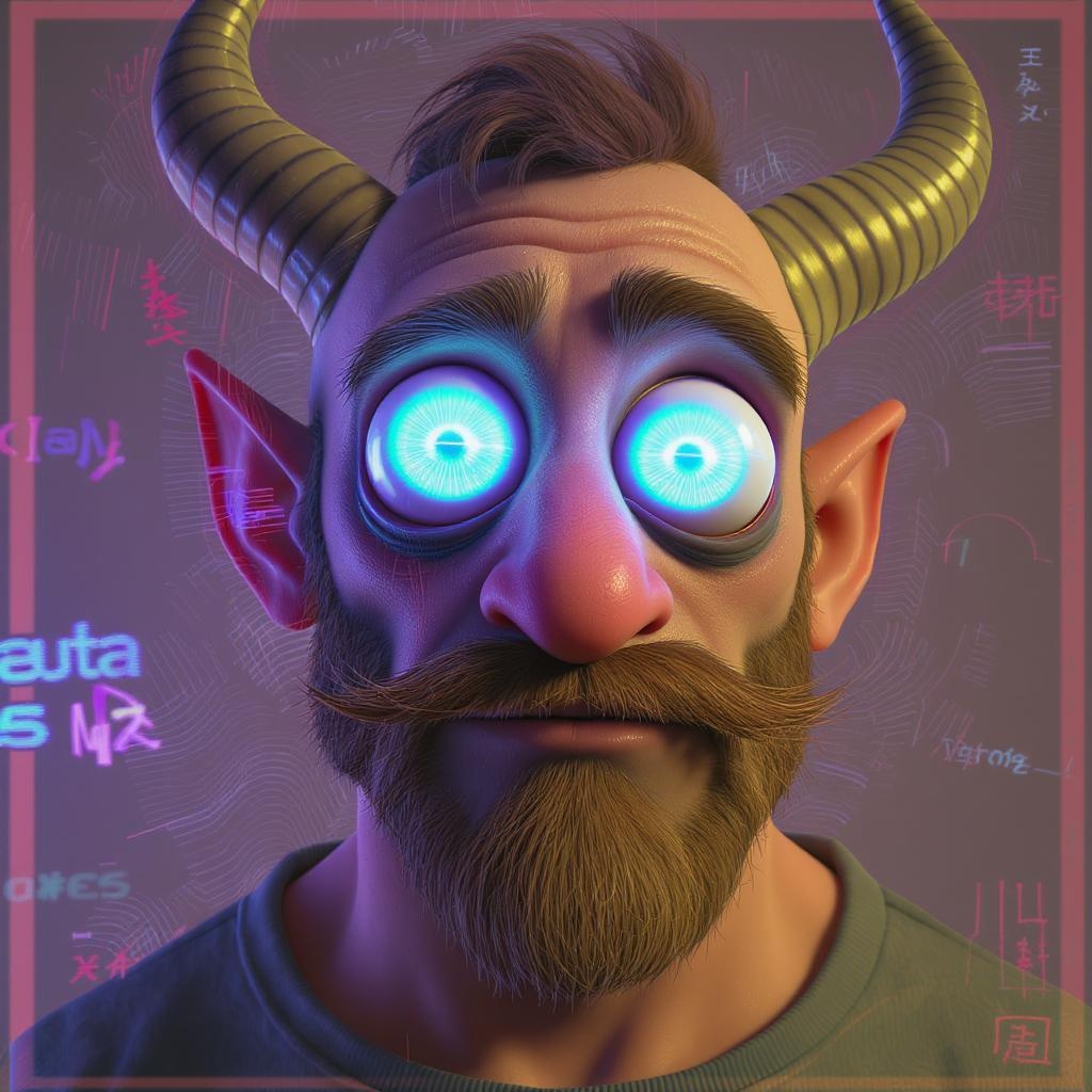 A close-up portrait of a man with horns and a beard, crafted by a senior character artist and winner of a polycount contest. Created in Unreal Engine 5, the image showcases bright, clear neon eyes reminiscent of Pixar style, with a focus on cute, big circular reflective eyes. Rendered with a cinematic smoothness and intricate detail, the artwork balances abstract and cartoon elements, with a playful and animated toy-like figure quality. The portrait, appearing blurry and disfigured with unique deformities, presents a framed, 3D character study. The quirky anatomy and surreal design convey an imaginative and whimsical essence. Despite the blurry quality and weird color palette, the character stands out in a visually intriguing and low-resolution execution, evoking a sense of poorly drawn yet artistically intriguing CG art, echoing a low-quality, oversaturated, abstract aesthetic with hints of text and logo impressions.