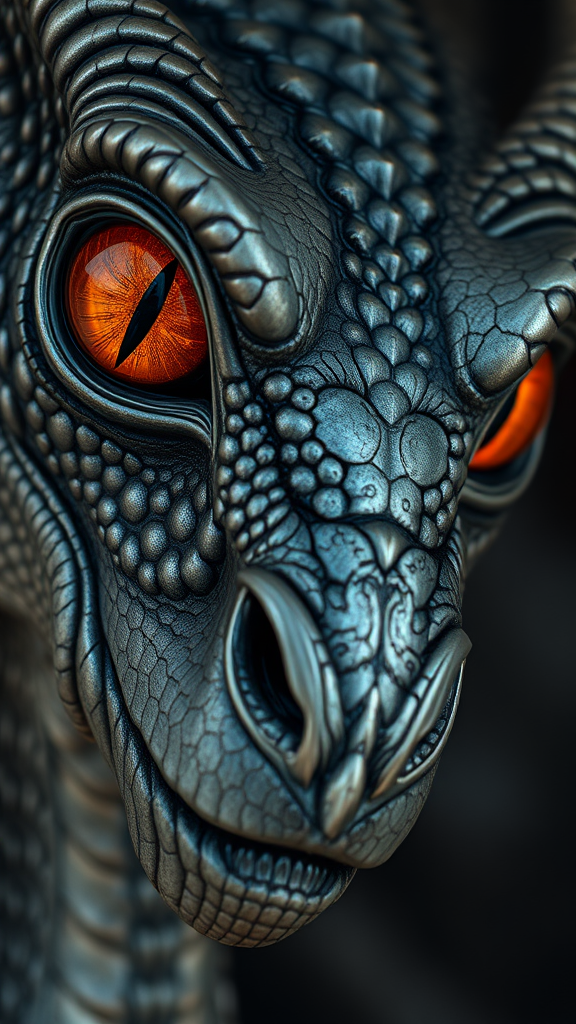 A close up portrait of a mythical creature that embodies the essence of wonder, exuding a mystical aura that is heavily exaggerated beyond human form, with very detailed close up dark amber orange reptilian humanoid eyes. Its presence is ethereal, existing only in the imagination, yet feels strikingly familiar to the human form, evoking a sense of unsettling mesmerizing beauty. Drawing inspiration from Julie Bell's iconic art style, the creature's intricate scales shimmer with a metallic sheen, and its elongated features, with delicate patterns reminiscent of ancient myths, create an enigma that captivates the observer, inviting them into a world of fantastical allure.