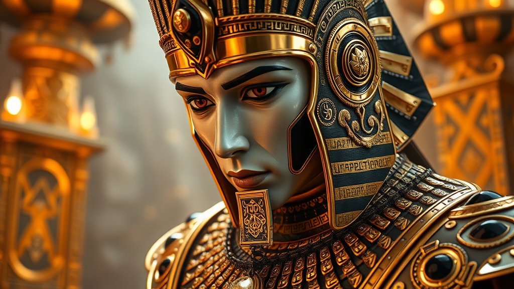 A close-up portrait of a Nubian king from ancient Egypt stepping into a mysterious realm, clad in metallic armor adorned in shades of white, black, and gold. His porcelain face features mechanical elements, blending baroque and rococo styles under cinematic lighting, following the golden ratio. Inspired by League of Legends, he strikes a dynamic pose, with an energetically detailed crystal chain armor. His sigil-etched metallic armor is covered in cryptic symbols, suggesting ancient rituals. The intricate gold work glimmers alongside 3D ornate altars, highlighting his pineal gland. The armor is adorned with crystallized black gems, presented in a highly detailed hyperrealistic style. Ambient occlusion and high-key photography enhance the 8K beautiful setting, with a bokeh effect adding depth. Metal diamond designs in gold are photorealistic, merging with an insanely intricate and hypermaximalist elegance. The scene is both ornate and hyper-realistic, rendered in 8K 3D, reflecting a blend of cartoon, anime, and sketches, crafted with exceptional detail.