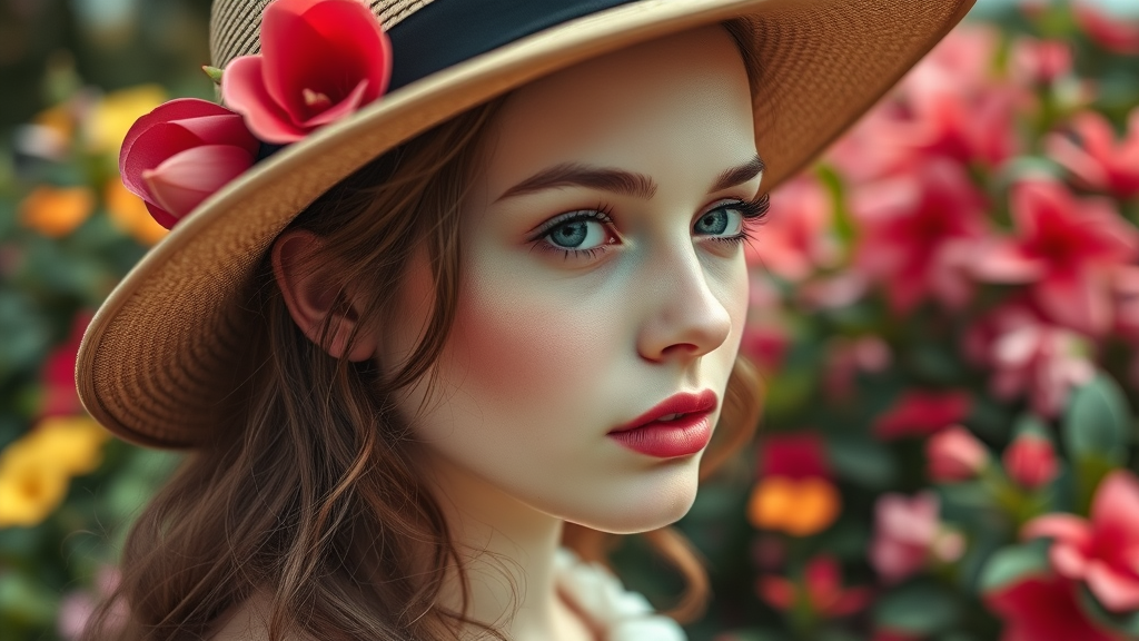 A close-up portrait of a person wearing a stylish hat set against a backdrop of lush, vibrant flowers in a garden during springtime in Kauai. Captured using anamorphic lenses for a dreamy aesthetic, the image recalls the style of a 2007 blog photo. The model, reminiscent of Amy Adams and Elle Fanning, possesses a feminine and delicate beauty with pastel pink and translucent skin tones akin to Tom Burke's, exuding an ethereal quality. The scene captures a nostalgic essence reminiscent of circa 1970s fashion, offering a serene and enchanting visual with a hint of mystique.