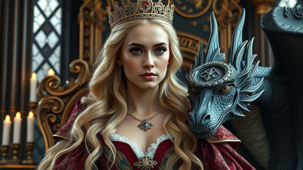 A close-up portrait of a regal and enchanting queen adorned in an exquisite royal robe, with a majestic dragon poised beside her in the grand throne chamber of the castle. Her detailed clothing enhances her elegance, and her long, flowing blonde hair complements her radiant skin. The scene is illuminated with dramatic lighting, accentuating the ultra-detailed setting. The composition maintains a focus on coherence and beauty, avoiding elements like undesirable anatomy or any disfiguring traits, ensuring the image remains clear, colorful, and intricately detailed without any unwanted distractions.
