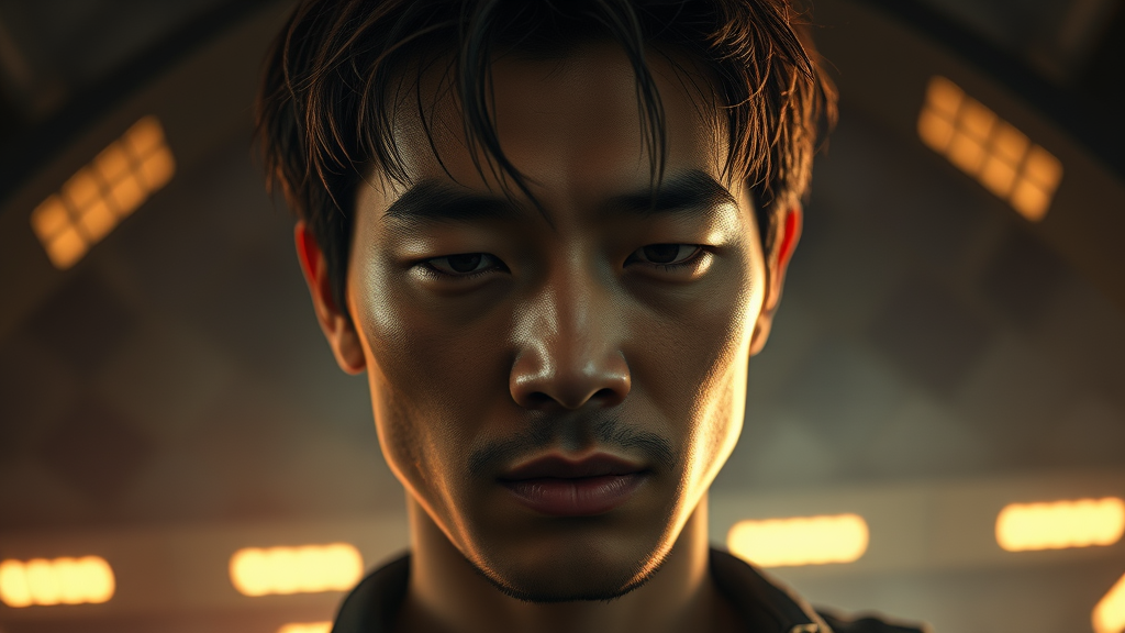 A close-up portrait of a ruggedly handsome 30-year-old Asian man with a stunningly detailed face, exhibiting a mysterious and peaceful expression. His hair is tousled and slightly dirty, adding to his allure. The background is oppressive yet contrasting, with dramatic backlighting creating a cinematic and expressive sci-fi atmosphere. The shot is taken from below, using a DSLR with an aperture of f/7, shutter speed of 1/100 sec, and ISO 150, capturing super detailed, hyper photorealistic textures and natural reflections. The cinematic lighting highlights the intricacies of his features, set against a gloomy yet engrossing setting. This image is devoid of deformations or anomalies, with perfect proportions and clarity, ensuring a clean and striking visual.