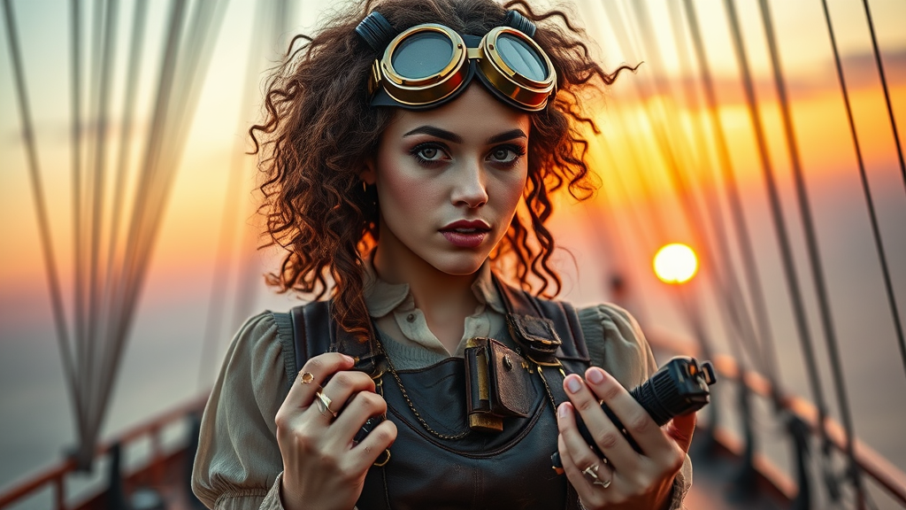 A close-up portrait of a striking female steampunk inventor aboard an airship at sunset. She wears intricate goggles with brass details and a leather apron over a victorian-style blouse. Her hair is a mass of wild curls with small gears woven in. The background features the elegant curves of the airship's deck bathed in warm orange and pink hues of the setting sun. Her expressive eyes reflect her inventive nature, and her hands grasp onto an array of curious tools and gadgets, showing signs of wear from her work. The scene captures an essence of creativity and innovation, free from distractions or clutter, with a focus on her captivating presence and the technological marvel of the airship.