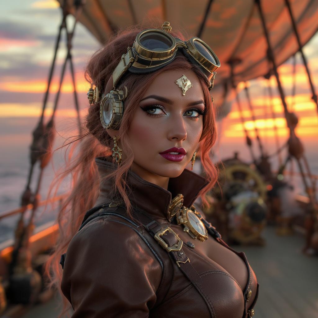 A close-up portrait of a stunning female steampunk inventor at sunset aboard an airship. She wears intricate goggles adorned with brass and gears, her hair styled elegantly with metallic accents. Her eyes are sharp and intelligent, reflecting the warm hues of the setting sun. The intricate design of her leather outfit, complete with buckles and clockwork elements, complements the steam and machinery surrounding her. The backdrop showcases the sprawling deck of the airship, with hints of steam rising around her. Her expression is one of confident curiosity, embodying the spirit of innovation and adventure.