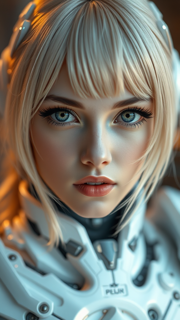 A close-up portrait of a stunning mecha girl with beige blonde hair featuring dark tips, an angelic and captivating face, seductive eyes, and pouty thin lips. She is adorned in intricate white-silver armor with elegant head accessories. The image boasts HDR quality with ultra-high detail, a mesmerizing bokeh effect, light bloom, and cinematic lighting that highlights her features. The scene is illuminated to add depth, resembling concept art from Unreal Engine 5 with photorealistic RTX rendering. The composition artfully obscures her arms and hands, focusing on her enchanting gaze and intricate details for an ethereal and futuristic ambiance.
