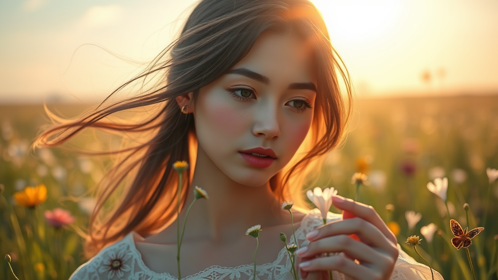 A close-up portrait of a stunning woman delicately gathering wildflowers in a sunlit meadow at dawn, inspired by Ken Sugimori's style. The scene captures the essence of summer with warm hues and soft light, bringing an anime-like charm to the image. The woman’s features are elegantly detailed, her expression serene as she appreciates the natural beauty around her. Her flowing hair catches the early morning breeze, adding a sense of movement and life. The setting is intimate, with a focus on her gentle gesture and the lush, vibrant backdrop of the meadow. The overall composition is harmonious and serene, with a dreamy, ethereal quality that evokes a peaceful morning in a picturesque landscape.