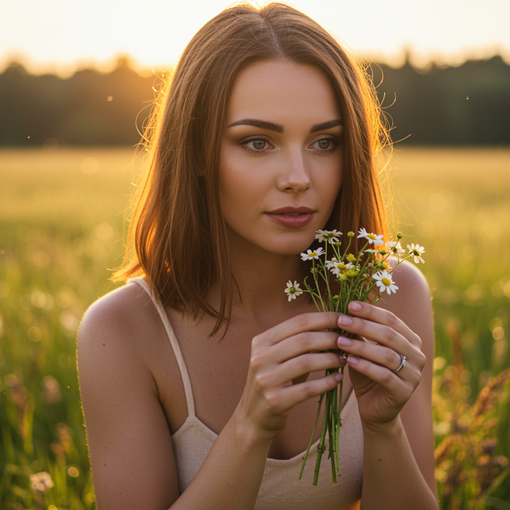 A close-up portrait of a stunning woman gathering flowers in a meadow at dawn, capturing the essence of summer in a low-resolution anime style. The scene reflects the gentle morning light, enhancing her delicate features framed by soft, flowing hair. She exudes a serene expression as she carefully selects blooms, her graceful movements blending harmoniously with the vibrant, dew-kissed landscape. The colors are warm and pastel, evoking a sense of tranquility and natural beauty. Her simple, elegant attire complements the idyllic setting, conveying a moment of peaceful connection with nature.