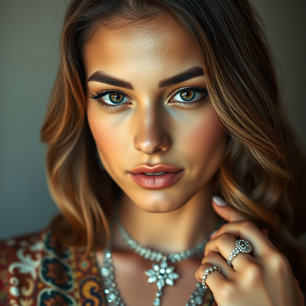 A close-up portrait of a stunning young woman, radiant natural skin, long wavy bob hairstyle, slender yet curvaceous figure, wearing a Persian Paisley blouse, adorned with exquisite diamond necklaces and rings, highly detailed, illuminated by gentle, warm lighting.