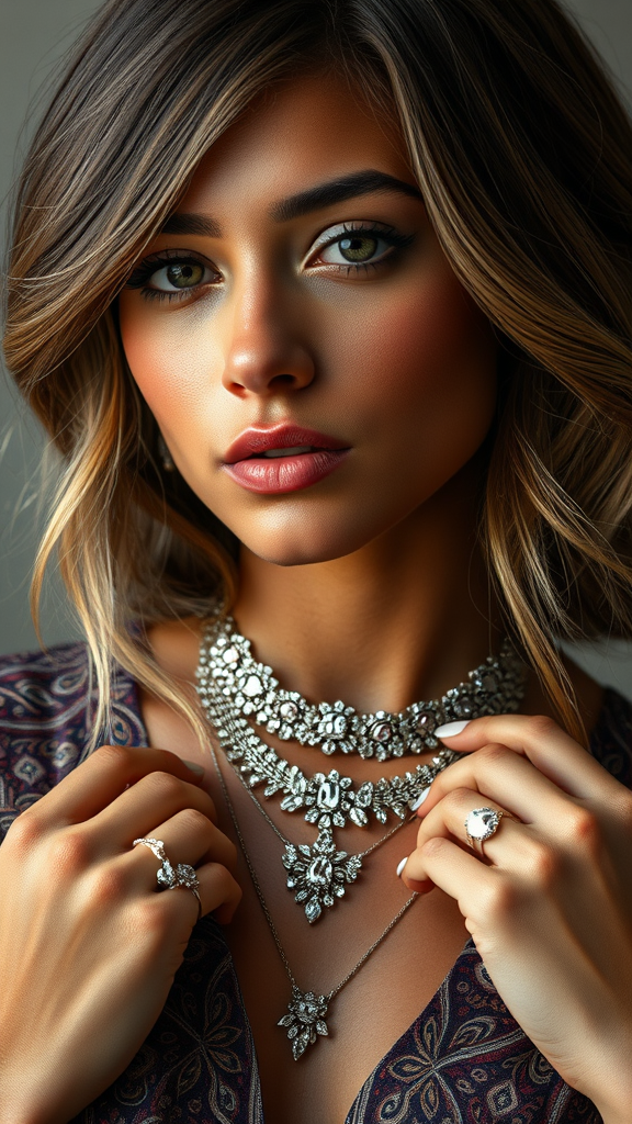 A close-up portrait of a stunning young woman with flawless natural skin, her hair styled in a long, layered bob with soft waves. She's slim with gentle curves, wearing a Persian Paisley blouse with intricate patterns. Adorning her neck are exquisite diamond necklaces that catch the light beautifully, and her fingers sparkle with delicate diamond rings. The lighting is gentle and diffused, highlighting the exquisite details of her ensemble and the serene expression on her face.