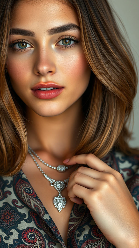 A close-up portrait of a stunning young woman, with smooth, natural skin and a long, layered bob haircut. She has a slim, curvaceous figure and wears a shirt adorned with intricate Persian Paisley patterns. Her look is accentuated by exquisite diamond necklaces and rings. The image captures fine details with gentle, flattering lighting, adding a touch of elegance and allure.