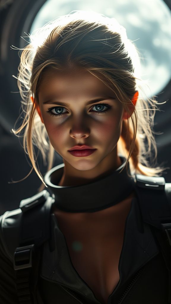 A close-up portrait of a stunningly beautiful young girl with an athletic figure and a captivating face, expressing a mix of frowning and innocence. Her hair is styled to complement her appearance. She wears a sci-fi combat jumpsuit reminiscent of Battlestar Galactica’s style from the 90s, set against a deep space background that is both oppressive and contrasting. The scene is dramatically backlit from within, creating a cinematic and expressive shot with a gloomy, horror-tinged atmosphere. Photographed from a low angle using a Canon EOS 5D Mark IV DSLR with an aperture of f/8, a shutter speed of 1/250 sec, and ISO 100, the image captures hyper-realistic details with textures reflecting natural light. The lighting features cinematic qualities, with tinted glass elements and an emphasis on symmetry. Creative modifications include focusing on a sleek and slender physique, highlighted by the futuristic attire, while ensuring high-quality visual details with no distortions or imperfections.