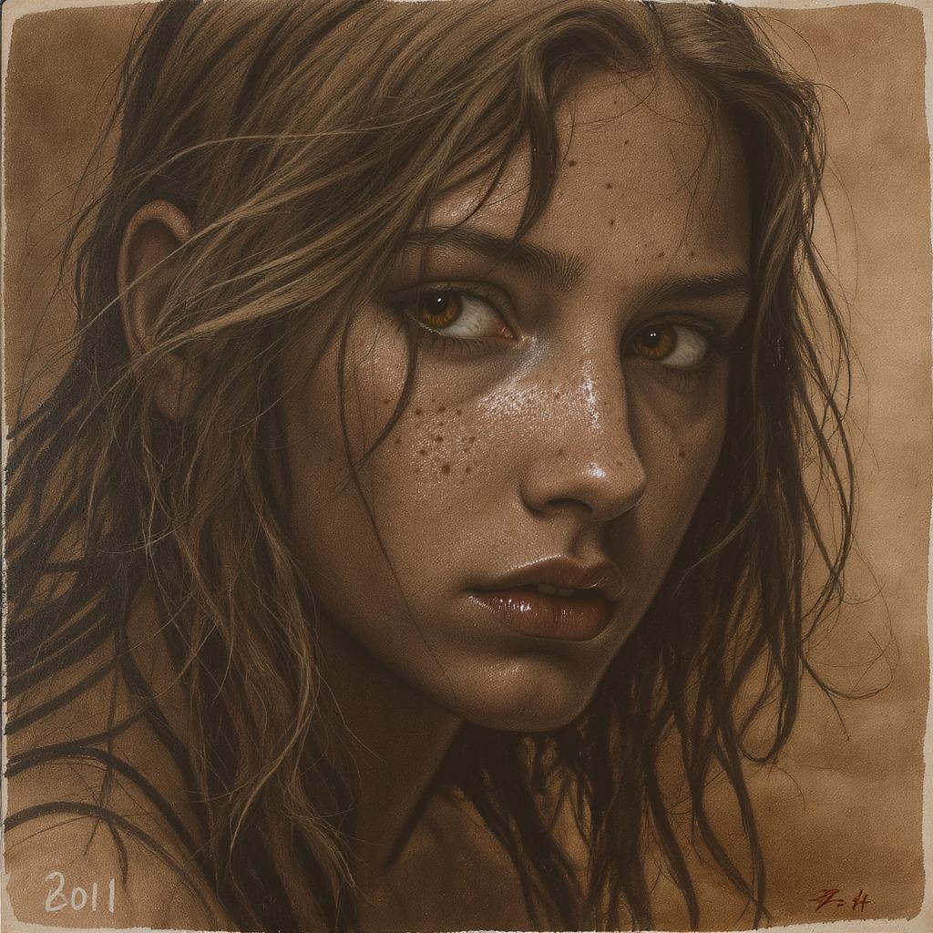 A close-up portrait of a teen-aged girl with a timid and vulnerable expression, her freckled face resembling the rich texture of soil, inspired by the style of Albert Watson and Antoni Pitxot. Her smooth, brown skin contrasts with the hyperrealistic detail captured in charcoal, echoing the artwork of Graham Humphreys. Designed as an epic music album cover, the image conveys a sense of beauty and depth, capturing the raw emotion of youth.