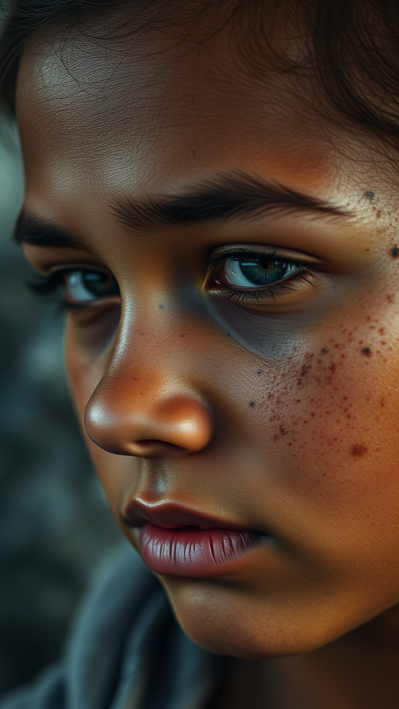 A close-up portrait of a teen-aged girl with freckles scattered across her face, reminiscent of the style of Albert Watson, her brown skin has the rich texture akin to fertile soil. Her expression is timid and vulnerable, capturing a moment of introspection. The image is hyperrealistic, with smooth shading and the intricate detail of charcoal art. Styled for an epic music album cover, it echoes the atmospheric influence of Antoni Pitxot. The composition holds a Graham Humphreys touch, bringing a subtle intensity to her gentle beauty, set against a softly blurred background.