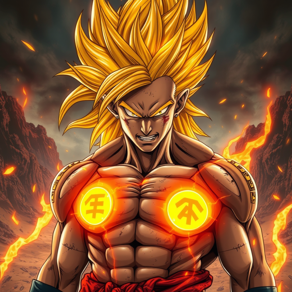 A close-up portrait of a warrior inspired by Goku, exuding fierce determination and extreme rage amidst a war-torn landscape. His extra-long, radiant yellow hair flows wildly, while his body, dirtied and injured, radiates a powerful orange and yellow aura that resembles molten fire. Glowing yellow runes adorn his muscular physique, pulsating with energy as he charges up his immense power. The backdrop features a dramatic landscape of jagged mountains and arid desert, emphasizing the epic scale of his surroundings. In an electrifying action pose, his visage is one of intense focus and raw emotion, evoking the futuristic glamour and energy-filled illustrations reminiscent of DC Comics. The symmetrical composition creates a captivating balance, with the use of redshift techniques enhancing the spectacular and dynamic nature of this scene.