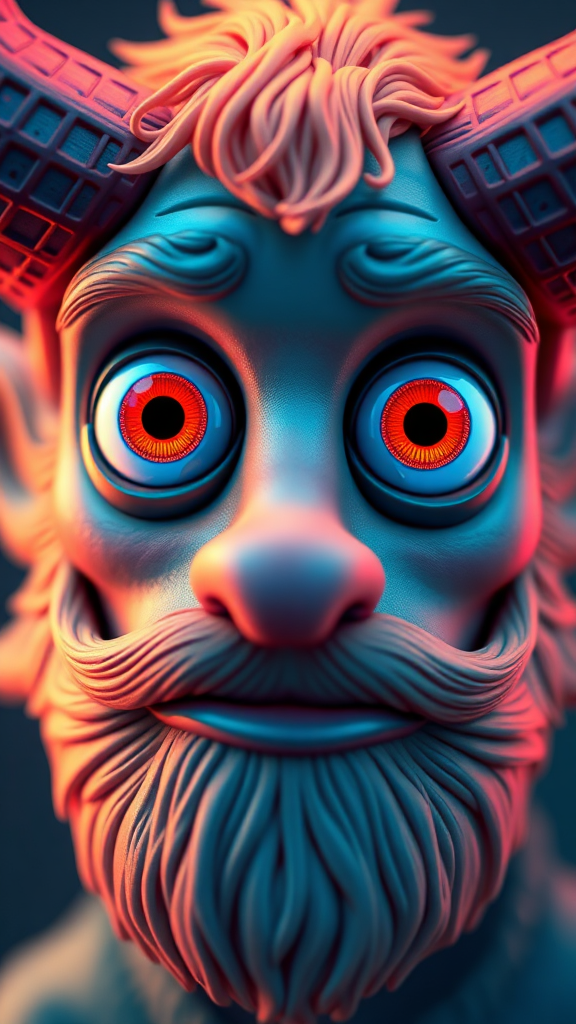 A close-up portrait of a whimsical man with horns and a textured beard, designed by a senior character artist known for winning the Polycount contest. This character is rendered in Unreal Engine 5, demonstrating vibrant and surreal neon Pixar-like eyes. His gaze is playful, evoking a sense of childlike wonder, akin to a creation by Nomeradona. The eyes are large, circular, and reflective, capturing a cinematic quality typical of Pixar renders. The scene is intricately detailed yet blurry, abstract, and slightly disfigured, with cartoonish and animated features. The character appears as a toy figure, posed and framed in 3D. Despite being anatomically unusual with extra limbs, this adds to the charm of being a cartoon, though the overall quality remains surreal. The color palette is purposefully oversaturated with bold and weird colors, enhancing the abstract nature of the scene. The image has a low-res, blurred quality with elements that suggest a work-in-progress, such as imagined text, writing, and a faint diagonal watermark, resembling a sketch made with pencils on paper, combined with CGI elements in a fascinating yet unconventional composition.
