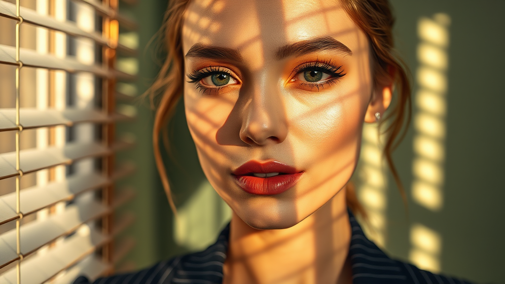 A close-up portrait of a woman bathed in gentle, golden afternoon light filtering through window blinds, casting intricate shadow patterns across her face. Her luminous complexion is radiant, showcasing dewy skin with softly defined cheekbones. Her captivating eyes, framed by long, delicate lashes, feature a touch of warm eyeshadow, while her lips are adorned with a soft coral hue. The backdrop is a subdued sage green, which complements the warmth of the scene. She is dressed in a sleek, navy pinstriped blazer, adding an elegant touch. The scene is hyperrealistic, with a keen focus on the fine details such as the texture of her skin and the dance of light and shadow, set within a palette of warm earthy tones and gentle pastels.