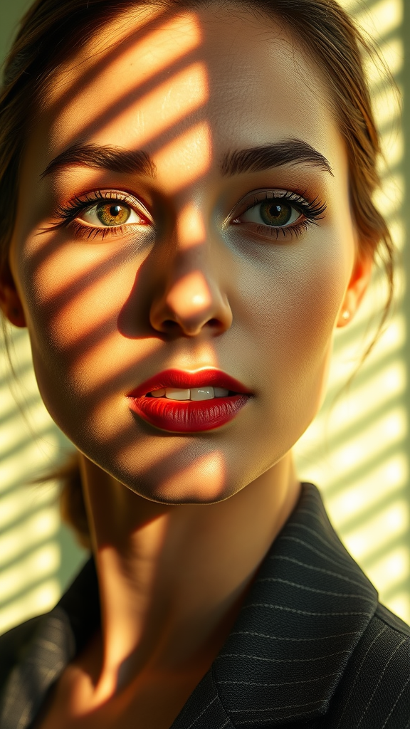 A close-up portrait of a woman bathed in gentle, golden afternoon light filtering through window blinds, casting intricate shadow patterns on her face. Her complexion is radiant and fresh, with a natural glow highlighting her cheekbones. Her expressive eyes are framed by long, luscious lashes and touched with a whisper of soft brown eyeshadow. Her lips are adorned with a delicate coral shade, adding a touch of warmth. The background is a soft sage green, accentuating the cozy ambiance of the scene. She is dressed in an elegant, charcoal pinstriped blazer, lending a sophisticated air. The image is hyperrealistic, capturing the fine texture of her skin and the subtle interplay of light and shadow, with a palette of warm earth tones and gentle pastels.