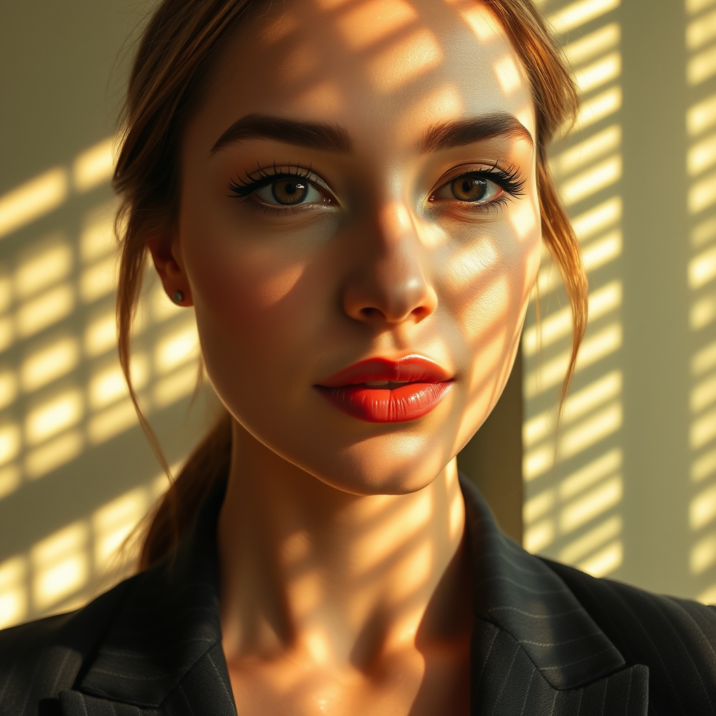 A close-up portrait of a woman bathed in soft, golden afternoon light that filters through window blinds, casting intricate shadow patterns across her face. Her complexion is naturally radiant with a luminous, dewy finish, and softly contoured cheekbones that catch the light. Her eyes, expressive and deep, are framed by long lashes and adorned with a faint haze of taupe eyeshadow. Her lips have a soft coral tint, complementing her warm skin tones. The background showcases muted sage green walls, subtly amplifying the warmth and intimacy of the scene. She dons a sleek, dark charcoal blazer with subtle pinstripes, exuding understated elegance. The portrayal is vividly realistic, capturing fine details like the texture of her skin and the delicate interplay of light and shadow, set against a palette of warm earth tones and gentle pastels.