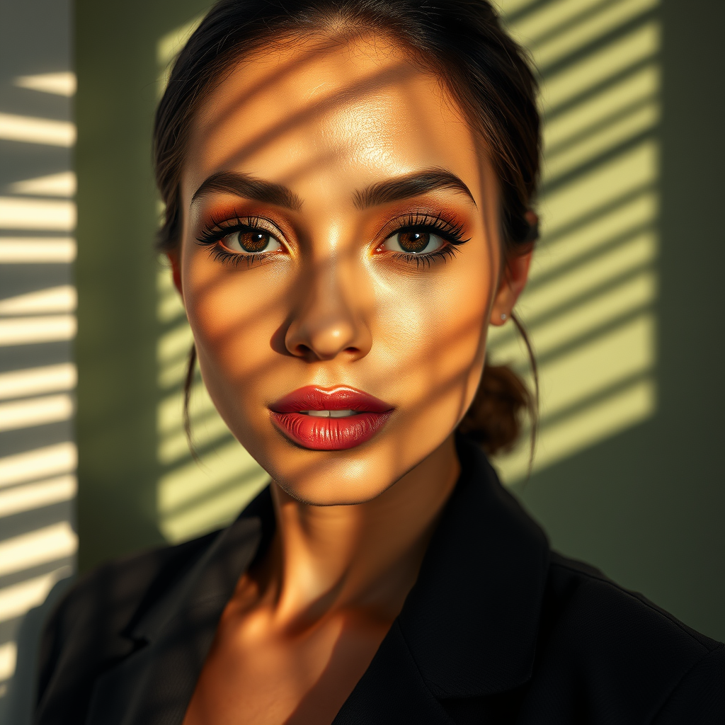 A close-up portrait of a woman bathed in the gentle glow of late afternoon light, filtering through window blinds to cast intricate shadow patterns over her face. Her skin radiates a natural, luminous sheen, with softly highlighted cheekbones adding dimension. Her deep, expressive eyes are framed by lush lashes and enhanced with a whisper of taupe eyeshadow, while her lips, in a delicate rose hue, add a touch of softness. Behind her, the walls are a muted sage green, enriching the scene's warmth. She's dressed in a dark, single-breasted blazer with subtle texture, lending an air of sophistication. The hyperrealistic portrayal captures exquisite details, from the fine texture of her skin to the graceful interplay of light and shadow, woven into a palette of earthy neutrals and gentle pastels.