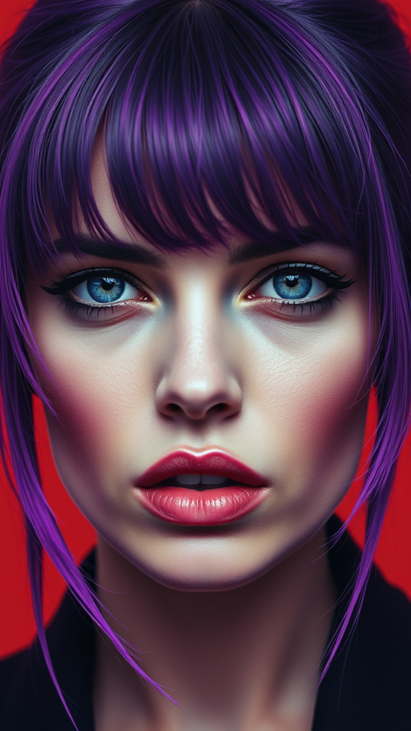 A close-up portrait of a woman featuring vivid violet hair, blending the essence of Andy Warhol and Richard Avedon, merging pop art's dynamic hues and graphic contours with high-contrast, minimalist photography. Her face is intricately detailed, showcasing an intense gaze, set against a bold, contrasting background, encapsulating the iconic and contemporary vibe of modern pop culture.