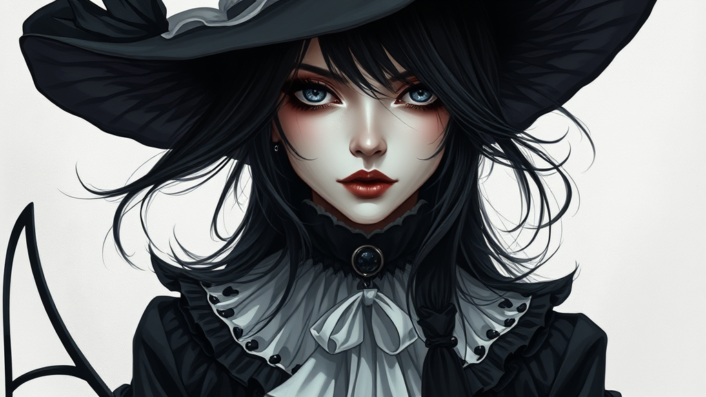 A close-up portrait of a woman wearing a striking black and white outfit, exuding a fashionable dark witch aesthetic. Her enigmatic presence is captured with a mix of elegance and mystery, drawing inspiration from the detailed digital artistry reminiscent of WLOP, Guweiz, and Loish. The artwork embodies a gothic yet sophisticated vibe, with intricate details highlighting her otherworldly allure. Her piercing gaze is framed by flowing dark hair, and subtle elements of gothic horror add depth to her character, creating a compelling goth girl who embodies both grace and shadow.