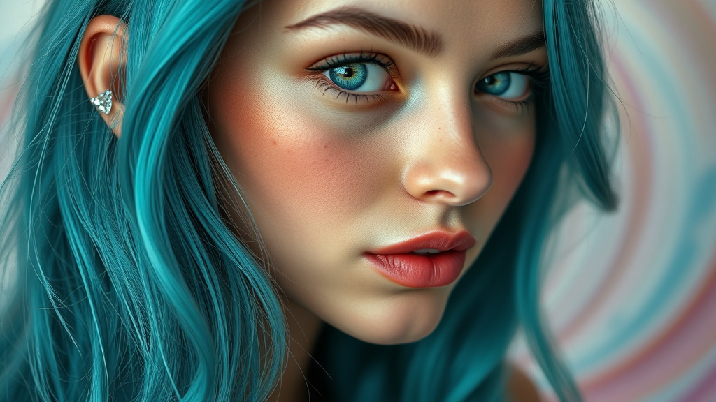 A close-up portrait of a woman with cascading turquoise hair, her eyes a striking shade of emerald green, reflecting a sense of mystery and allure. The soft lighting enhances her flawless skin while subtle freckles dance across her cheeks, adding a touch of playfulness to her serene expression. Wearing a delicate silver ear cuff that glints softly, she embodies a modern, ethereal presence, surrounded by an abstract swirl of pastel colors in the background, suggesting a dreamy atmosphere.
