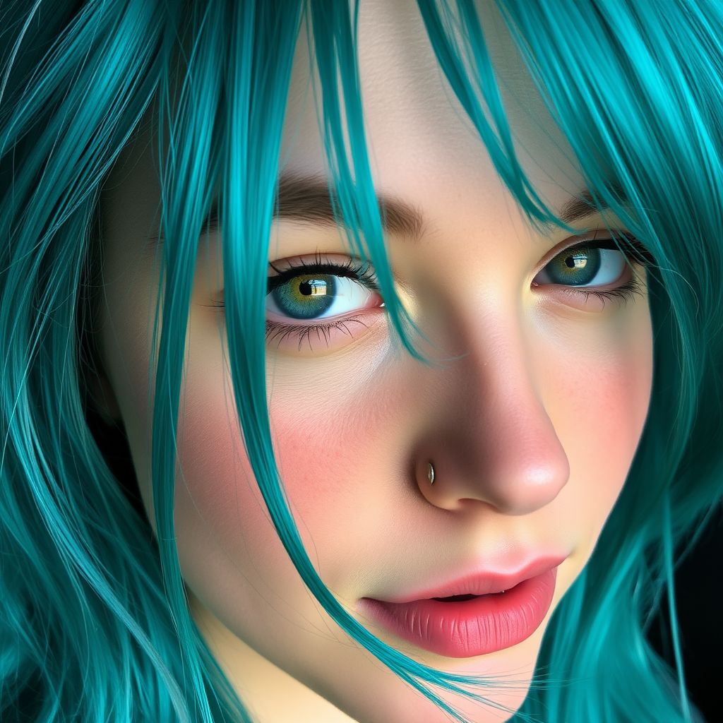 A close-up portrait of a woman with striking turquoise hair, her eyes reflecting shades of emerald green, soft freckles across her cheeks, and wearing a subtle silver nose ring.