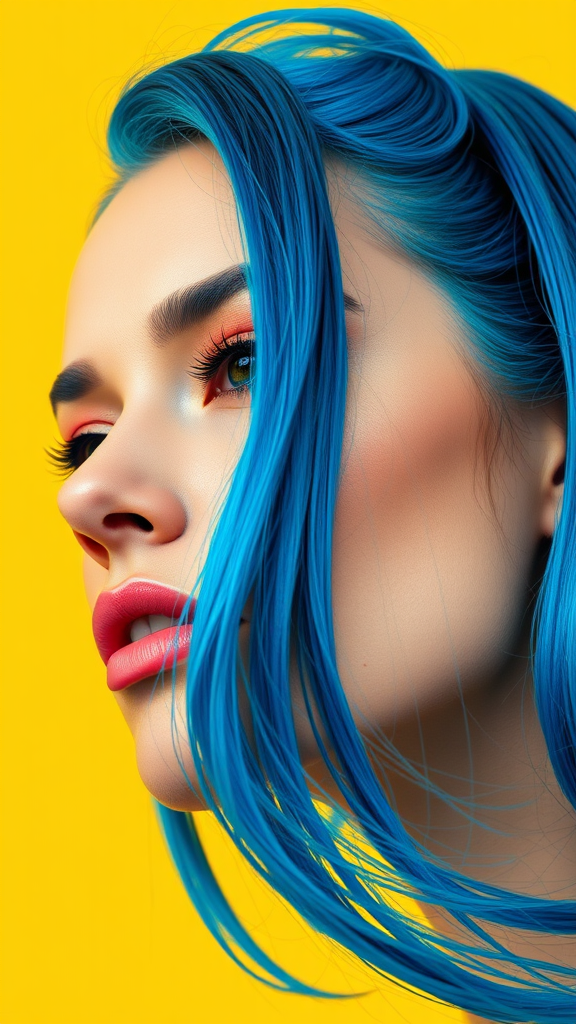 A close-up portrait of a woman with vivid cerulean blue hair, inspired by the styles of Andy Warhol and Richard Avedon, merging pop art's dynamic colors and graphic lines with high-contrast, minimalist photography. Her face is intricately detailed, featuring an intense, captivating gaze, and set against a bold, contrasting yellow background. This image embodies the iconic and contemporary essence of modern pop culture.