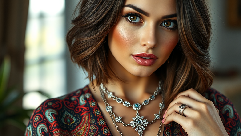 A close-up portrait of a young beautiful woman with soft, radiant skin and a long layered bob hairstyle, exuding elegance with her slim yet curvy figure. She wears a vibrant Persian Paisley blouse, adorned with exquisite diamond necklaces and rings that catch the light. The scene is captured with high detail and gentle, flattering lighting, enhancing her natural beauty and the intricate patterns of her attire. Her eyes reflect a sense of depth and mystery, completing the captivating image.
