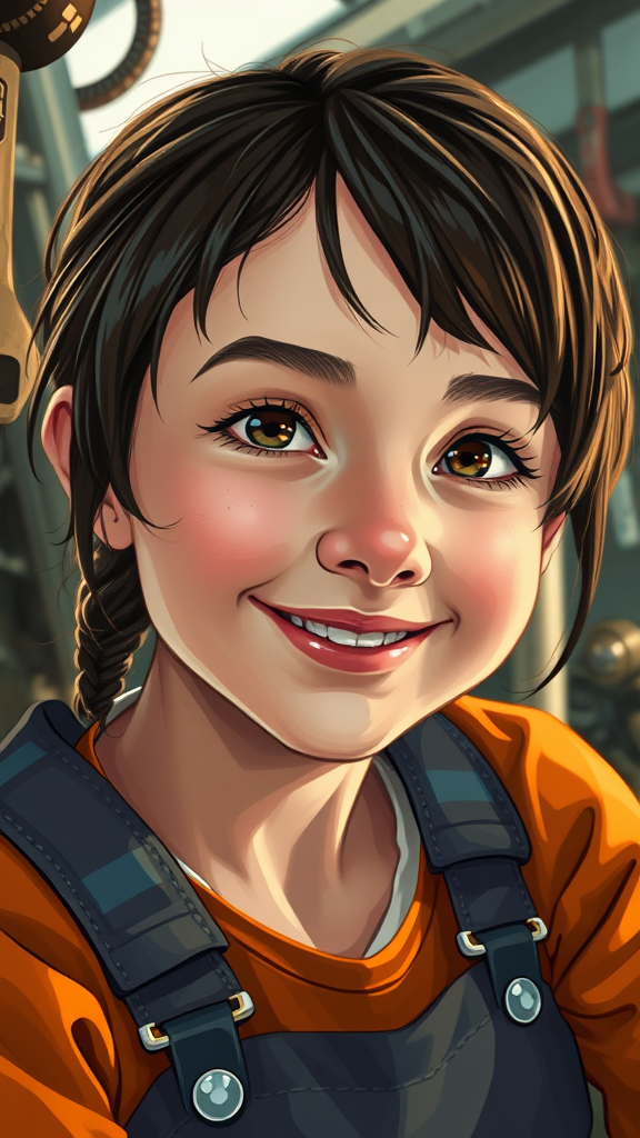 A close-up portrait of a young mechanic girl sitting and enjoying her afternoon, her cute face radiating happiness and energy. The setting is an ultra-detailed dystopian mechanic interior, showcasing intricate design elements in the background. Her expression is youthful and innocent, with detailed eyes, nose, mouth, and lips. The interior features ultra-detailed tools like a wrench and screwdriver, complementing her mechanic persona. The artwork is a 2D digital illustration with a vibrant color palette, inspired by the aesthetic of Ghost in the Shell. The image captures a harmonious blend of a detailed, cinematic style with a flat color design, creating a beautiful and stunning masterpiece. An emphasis on maintaining visual clarity and detail ensures the portrait is captivating and vividly expressive.