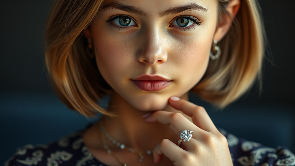 A close-up portrait of a young, stunning girl with radiant, natural skin and a long, layered bob hairstyle. She is elegantly slim with gentle curves, wearing a Persian Paisley blouse that complements her delicate features. Adorning her are exquisite diamond necklaces and rings that catch the soft, ambient lighting, adding an understated glamour. The image is rich in detail, capturing the essence of her youthful beauty and sophisticated allure.